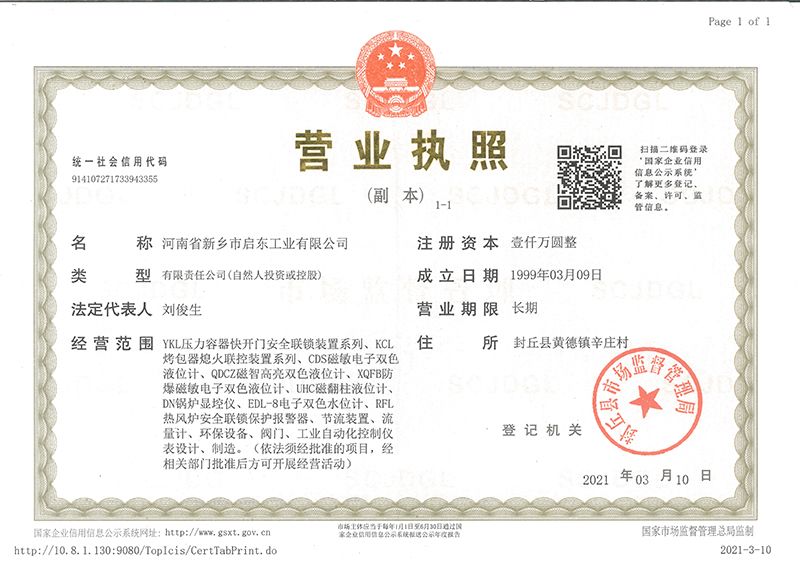 河南省新鄉(xiāng)市啟東工業(yè)有限公司始建于1987年,是專注研發(fā)、生產(chǎn)自動化儀器儀表(主要與壓力容器、鍋爐等容器配套使用)的廠家。主要產(chǎn)品有液位計(磁敏雙色型、磁翻柱型等)系列、烤包器熄火聯(lián)控裝置系列、壓力容器快開門安全聯(lián)鎖保護裝置系列、鍋爐報警器系列。二十多年來,公司產(chǎn)品暢銷國內(nèi)并遠銷俄羅斯、蒙古與東南亞,深得廣大用戶的信賴和好評。我們多年來致力于自動化儀器儀表的研制生產(chǎn),公司現(xiàn)具有完善的生產(chǎn)、試驗、檢測手段和設(shè)備。科技創(chuàng)新、誠信服務(wù),是我們不變的經(jīng)營理念,我們將以強有力的技術(shù)支持及售后竭誠為客戶提供良好的服務(wù)。  2012年我公司成功研發(fā)了KCL系列烤包器熄火聯(lián)控裝置,并于2013年2月2日榮獲中華人民共和國國家知識產(chǎn)權(quán)局辦法的《實用新型**證書》<**號:2021202257735>該產(chǎn)品廣泛應(yīng)用于唐鋼等大型鋼鐵企業(yè),為烤包器安全作業(yè)提供了有力的保障?! ?002年我公司成功研發(fā)磁敏電子雙色液位計獨特的高亮度LED紅綠雙色顯示,獲得了專家的首肯和用戶的一致好評。在此基礎(chǔ)上我公司研發(fā)人員十年磨一劍,致力于XQFB-1防爆型磁敏雙色液位計的研發(fā),于2013年12月27日由國家防爆電器產(chǎn)品質(zhì)量監(jiān)督檢驗中心檢驗合格并頒發(fā)防爆合格證書<編號:cnex19.0883>。該產(chǎn)品性能得到了充分的發(fā)揮,廣泛應(yīng)用于含有Ⅱ類A·B級T1-T4組可燃氣體或蒸汽與空氣混合形成的爆炸性混合物的0區(qū)、1區(qū)危險場所。連接用戶DCS或PLC系統(tǒng)實現(xiàn)遠距離集中顯示和控制,從而實現(xiàn)節(jié)能、數(shù)字化管理。為用戶增加了一定的經(jīng)濟效益和社會效益,。2014年公司成功申請了夢潤儀表的logo,新的品牌新的形象,夢潤儀表是啟東的LOGO, 歡迎新老用戶前來洽談合作?! ∥覀円蝗缂韧刈⒅乜蒲械耐度?,憑借產(chǎn)品的不斷更新、加大科技含量,進一步拓展市場。我們相信品質(zhì)成就未來,以過硬質(zhì)量、優(yōu)惠價格、完善的售后服務(wù)熱忱歡迎廣大客戶來我司視察指導(dǎo)、洽談業(yè)務(wù);精誠合作,共創(chuàng)輝煌!